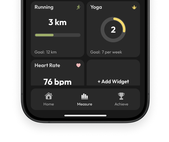 The measure screen allows users to log essential metrics — steps, calories, heart rate — offering real-time data visualization for informed health adjustments.