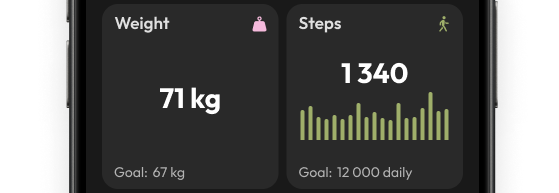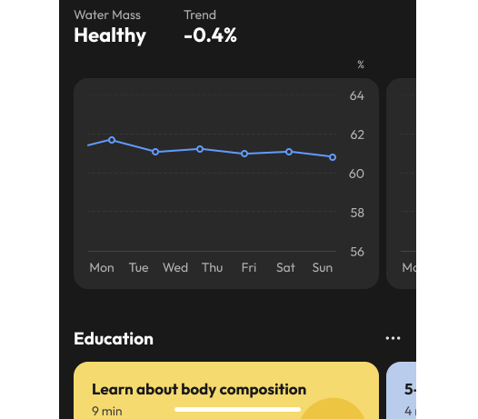 The body composition widget tracks fat and muscle changes, offering a quick overview of progress. The detailed screen enables users to analyze metrics over time for goal setting.