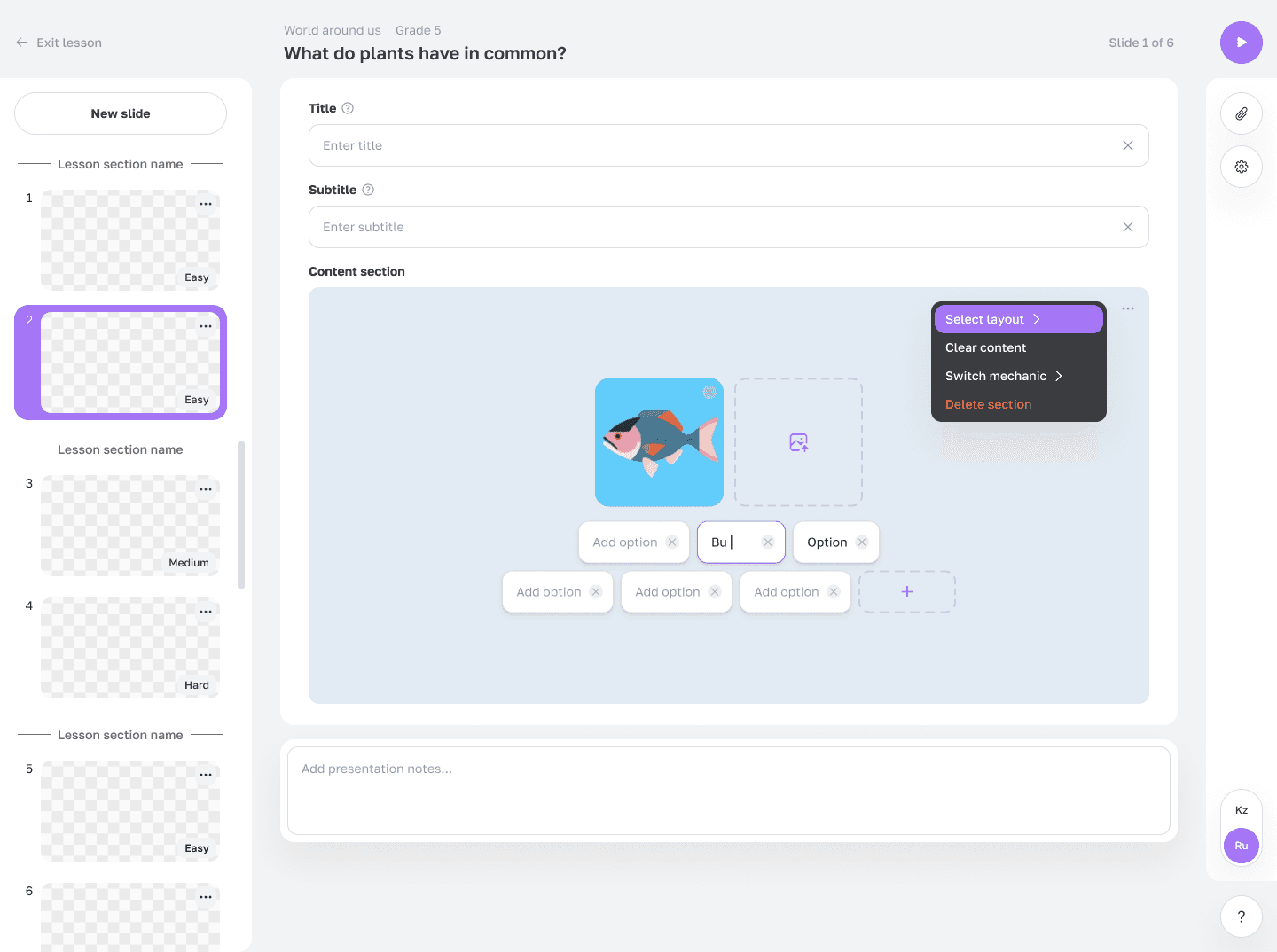 To solve this, I proposed restructuring the editor into a modular, template-based system. Each slide begins by selecting a mechanic template, opening a focused editing mode instead of a single overloaded interface.