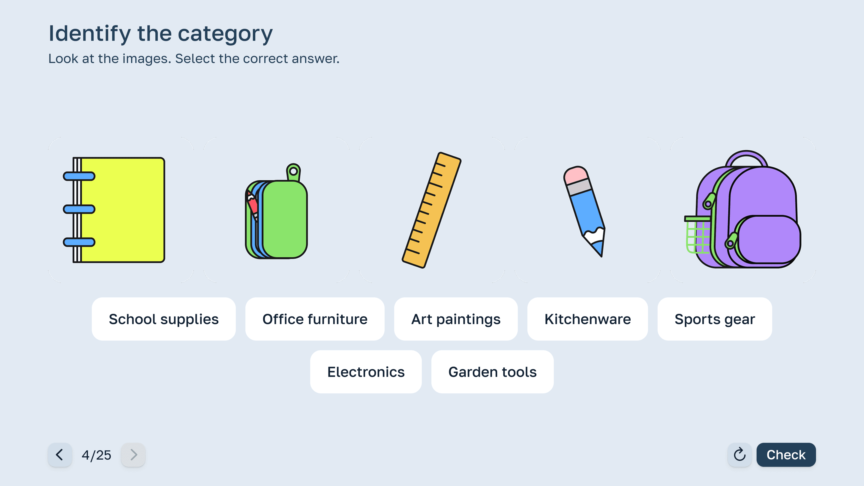 To unblock content production, scope was intentionally limited. We defined an initial pack of eight mechanics (including test, matching, and sorting) to enable faster assembly, predictable quality, and a repeatable production pattern.